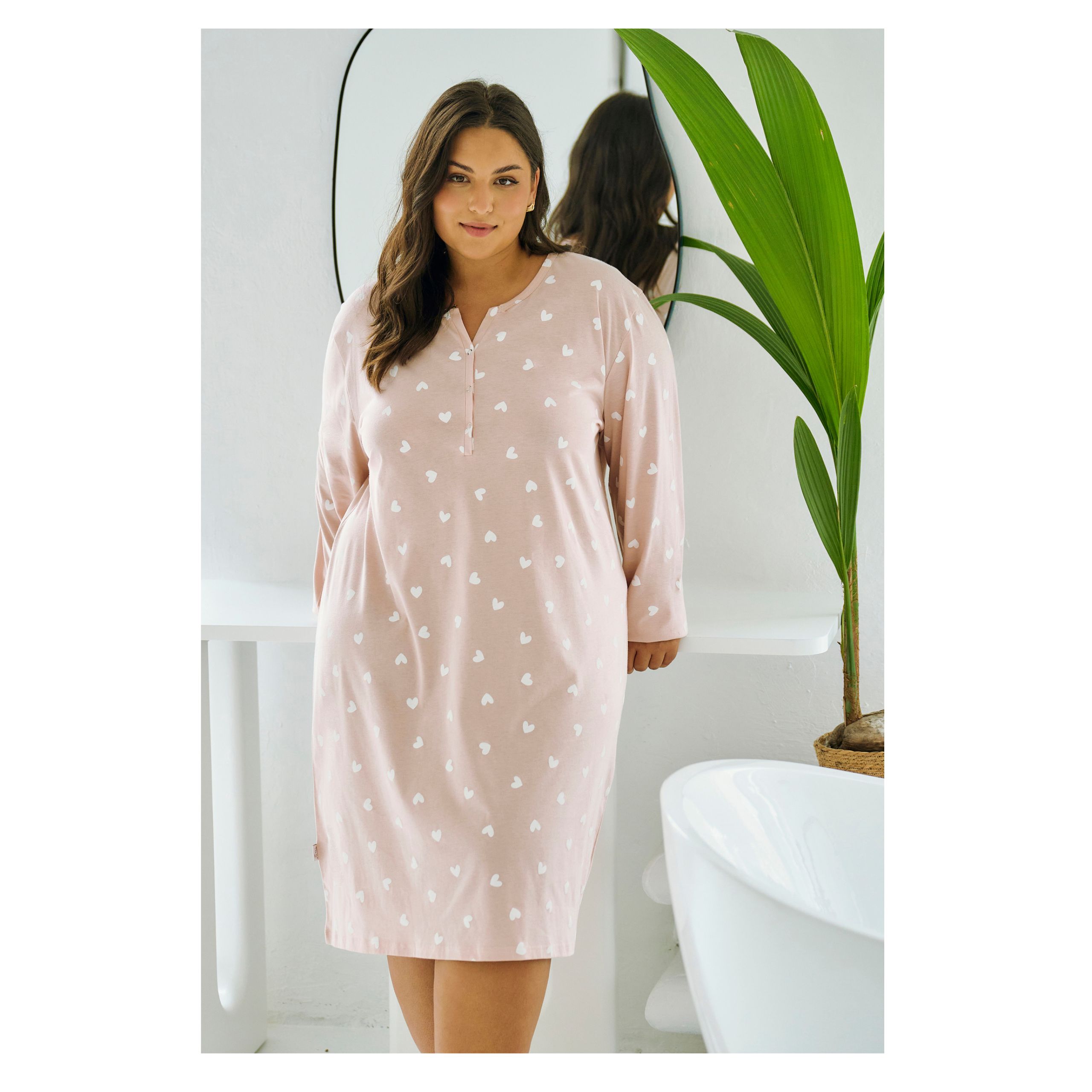 Delikatna i kobieca koszula nocna z długim rękawem, wykonana z miękkiej, lekkiej dzianiny, która otula ciało niczym druga skóra. Uroczy wzór w drobne serduszka nadaje całości romantycznego charakteru.