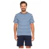 Męska piżama w paski z krótkim rękawem i krótkimi spodenkami to idealna propozycja do spania i domowego wypoczynku. Wykonana z miękkiej bawełny z domieszką elastanu, zapewnia komfort, przewiewność oraz swobodę ruchów przez całą noc.