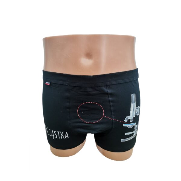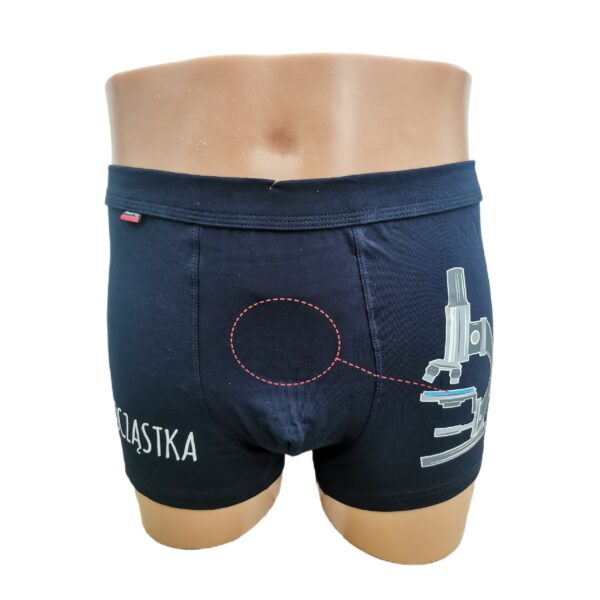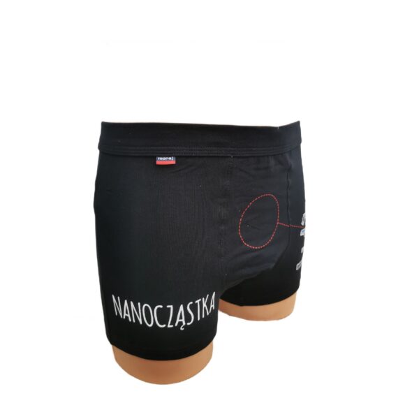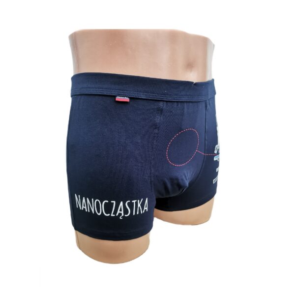 Śmieszne bokserki męskie z nadrukiem "Nanocząstka" oraz mikroskopem. Bokserki idealne na prezent. Wysokiej jakości materiał oraz nieuciskająca guma gwarantują komfort podczas noszenia.