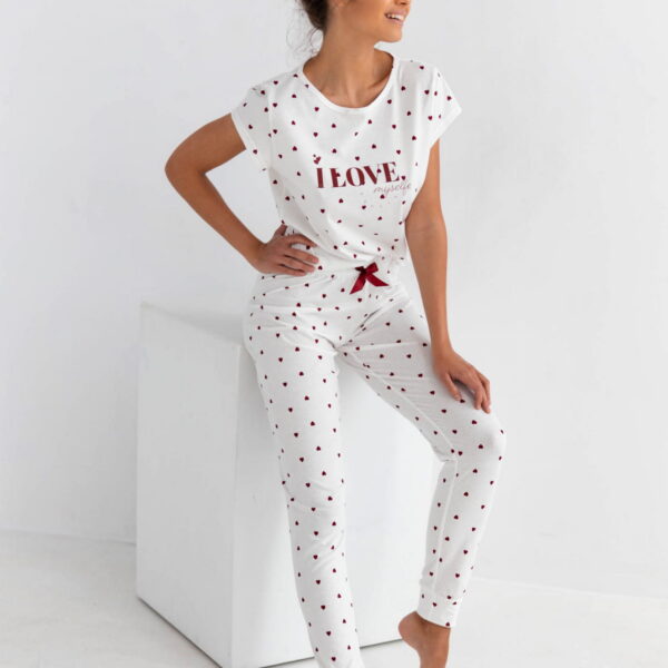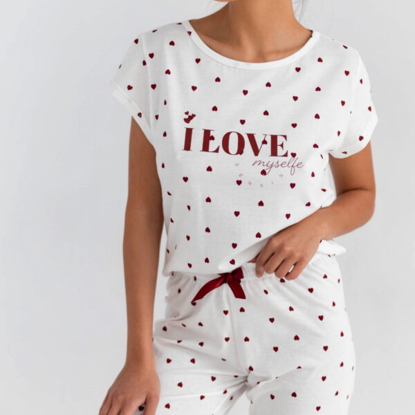 Urocza piżamka w delikatne bordowe serduszka. Wykonana z wysokiej jakości bawełny. W zestawie koszulka z krótkim rękawem z napisem "I love myself" oraz długie spodnie.