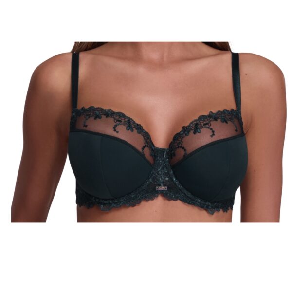 Dolna część miseczek została wykonana z miękkiej pianki pokrytej elastyczną dzianiną, co zapewnia doskonałe podtrzymanie i wygodę przez cały dzień. Górę miseczek zdobi subtelny haft na transparentnym tiulu – lekki, kobiecy, zmysłowy. Idealny półusztywniany model.