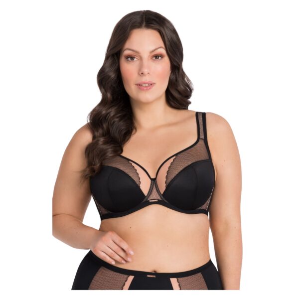 Miseczki i materiał: Miękkie miseczki wykonane z kryjącej dzianiny oraz subtelnej koronki, podszytej delikatną siateczką – gwarantują komfort i styl. Konstrukcja doskonale modeluje biust i zapewnia stabilność nawet przy większych rozmiarach.