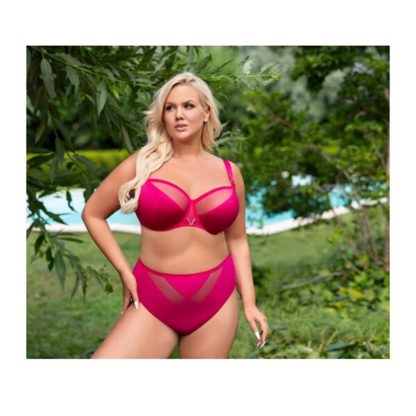 Piękny fuksjowy biustonosz z miękkimi miseczkami. Idealny na wiosnę. Ta konstrukcja będzie świetna dla średnich, dużych i bardzo dużych biustów. Gładkie miseczki z przejrzystą siateczką u góry, stabilny obwód z boczną fiszbiną i podwyższonym mostkiem.