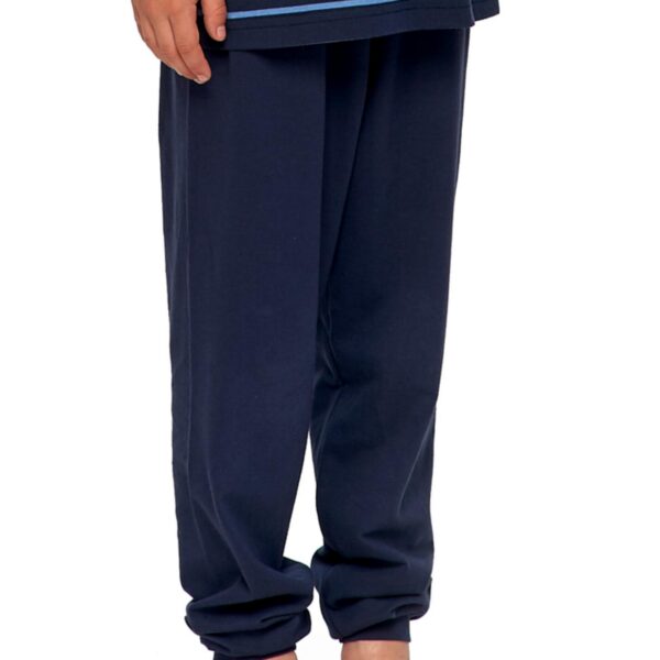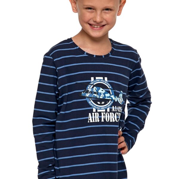 Bawełniana piżama chłopięca z długim rękawkiem i spodniami. Góra piżamy ozdobiona jest wzorem w paski. Spodnie posiadają elastyczną gumę w pasie, a więc idealnie dopasowują się do sylwetki. Nogawki zakończone są ściągaczem. Piżama wykonana z wysokiej jakości materiałów gwarantuje pełną wygodę podczas snu. Bawełna jest przyjazna dla alergików. Niewielka domieszka elastanu nadaje materiałowi sprężystości. Nieopinający krój zapewnia swobodę ruchów.