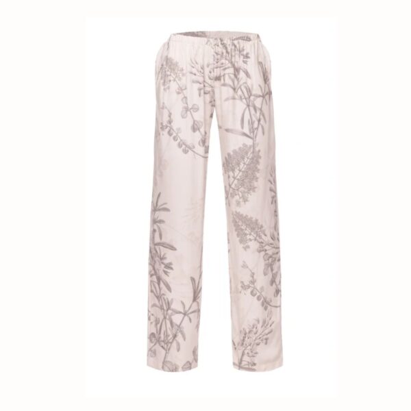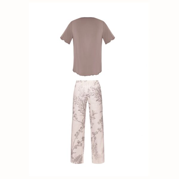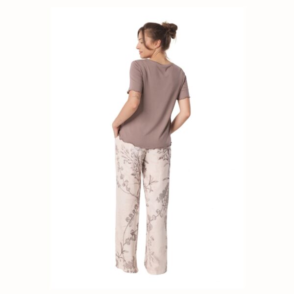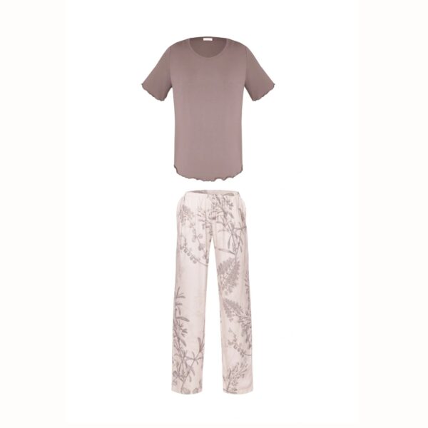 Zestaw składa się z luźnej bluzki z krótkim rękawem i klasycznym, okrągłym dekoltem oraz długich spodni wyposażonych w praktyczne kieszenie. Elastyczna gumka w pasie zapewnia wygodne dopasowanie do sylwetki, a swobodny fason nie krępuje ruchów.