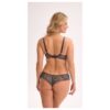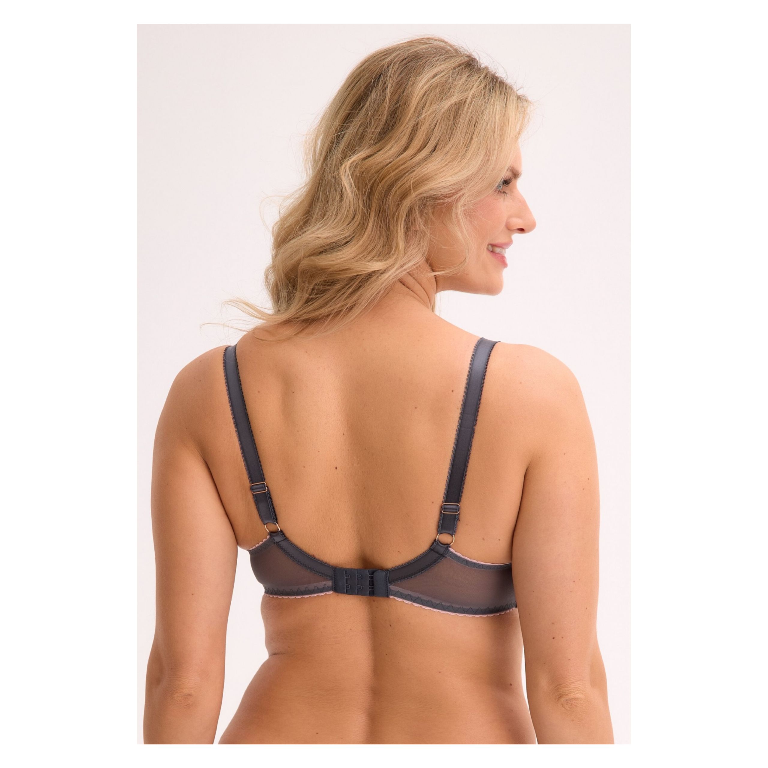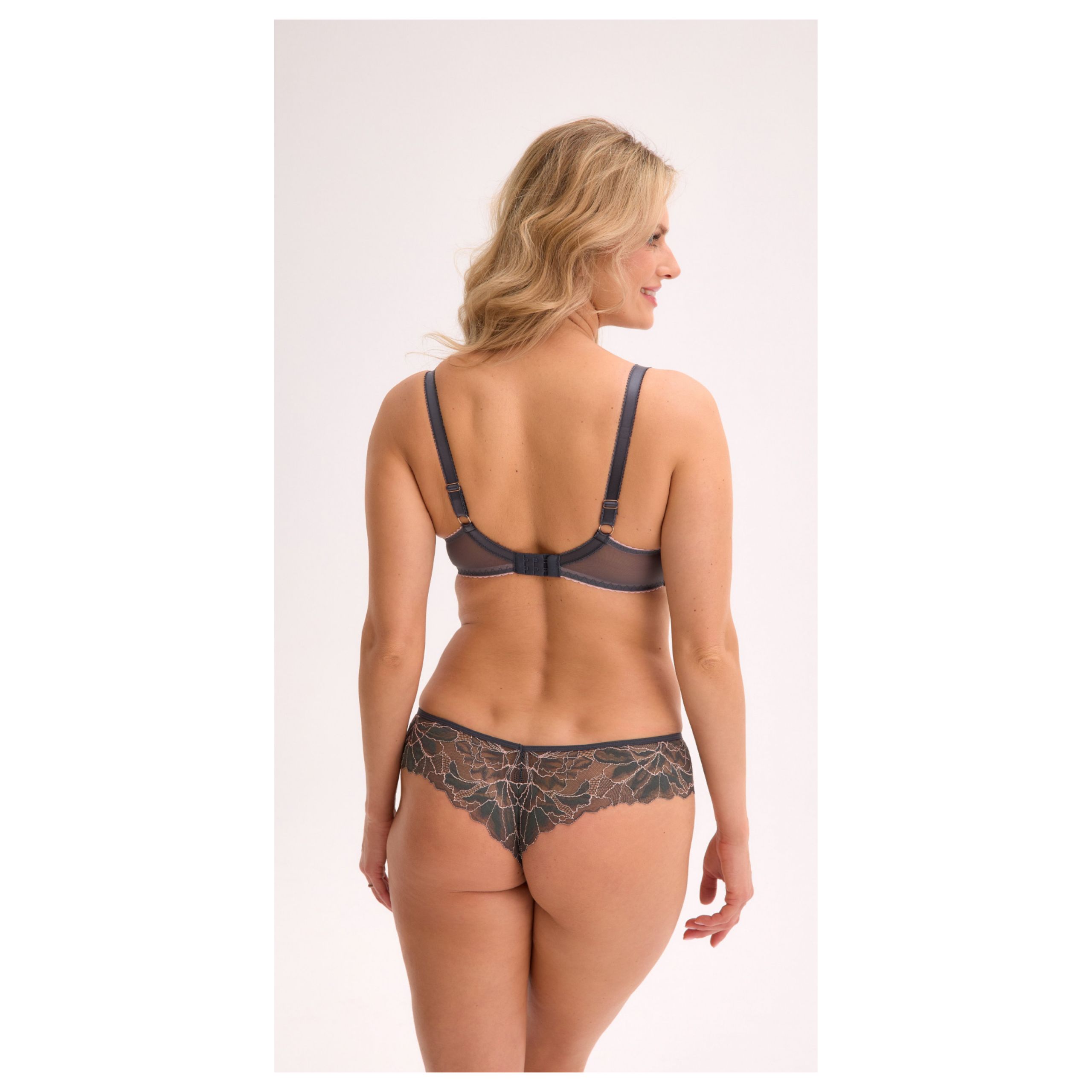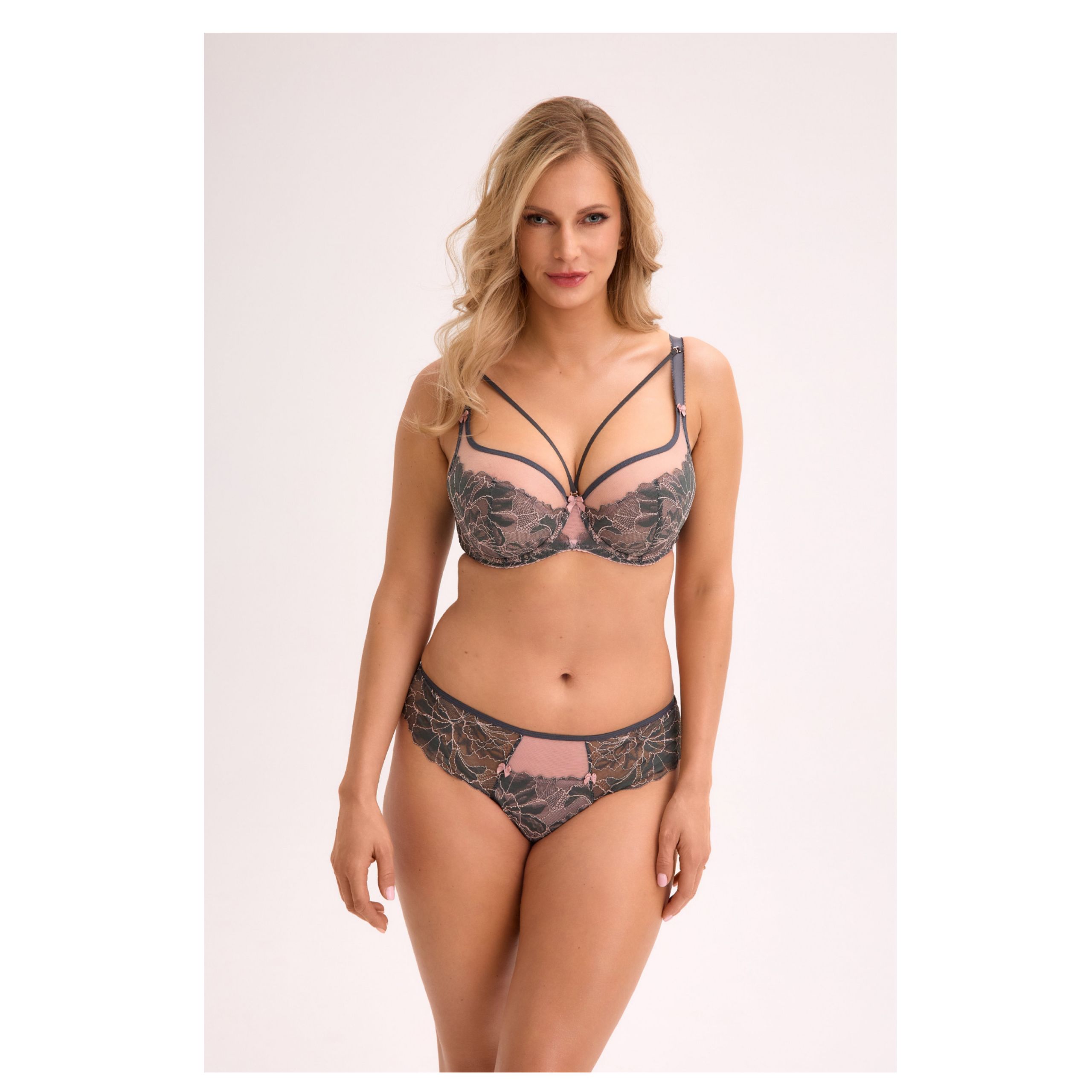 Delikatna grafitowa koronka, subtelny różowy akcent, tiul i ozdobne odpinane paski tworzą zmysłową, ale i funkcjonalną całość.