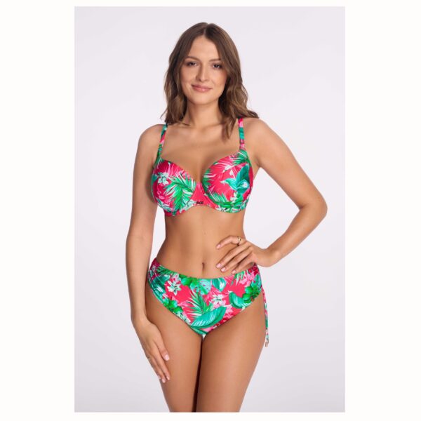 Usztywniane miseczki z fiszbinami skutecznie zbierają i unoszą biust, nadając mu naturalny, atrakcyjny kształt oraz zapewniając komfort noszenia przez cały dzień. Intensywny, tropikalny print podkreśla opaleniznę i dodaje stylizacji wakacyjnego, energetycznego charakteru.