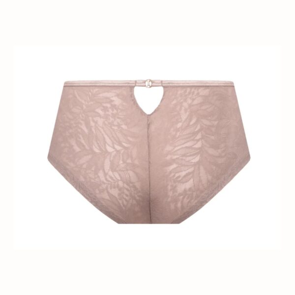 Majtki wykonane są z lekkiej, elastycznej koronki o efektownym, roślinnym wzorze, która perfekcyjnie dopasowuje się do sylwetki, podkreślając jej naturalne kształty.